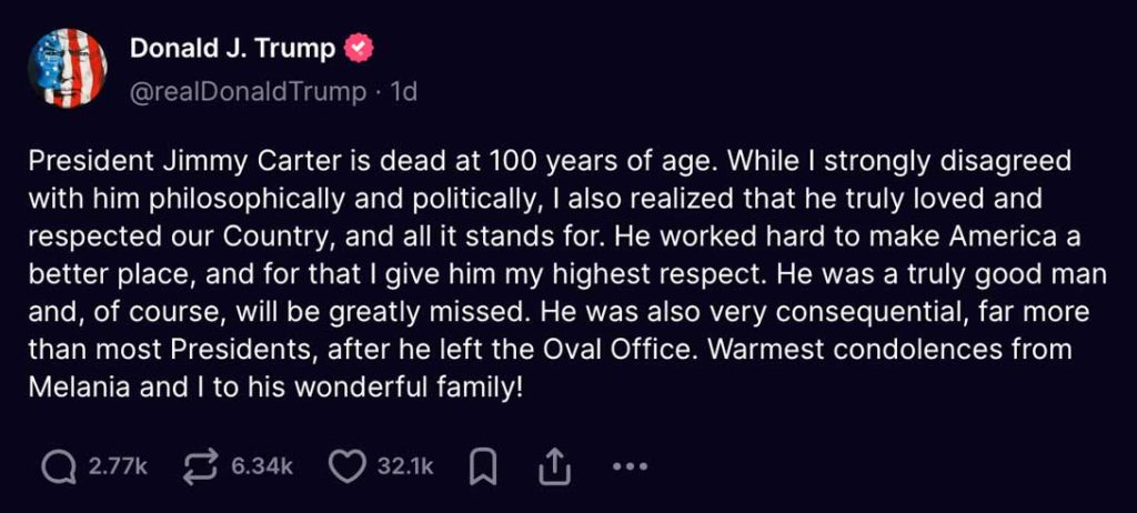 Tributes from figures like President Joe Biden, who declared a National Day of Mourning, and from across the political spectrum, from Donald Trump to Barack Obama, have highlighted Carter’s integrity, his approach to leadership, and his post-presidential service.