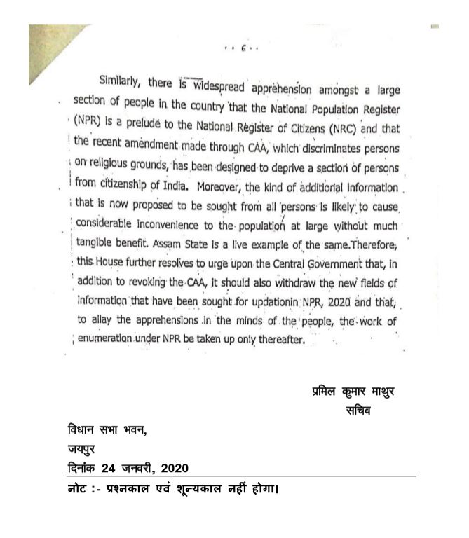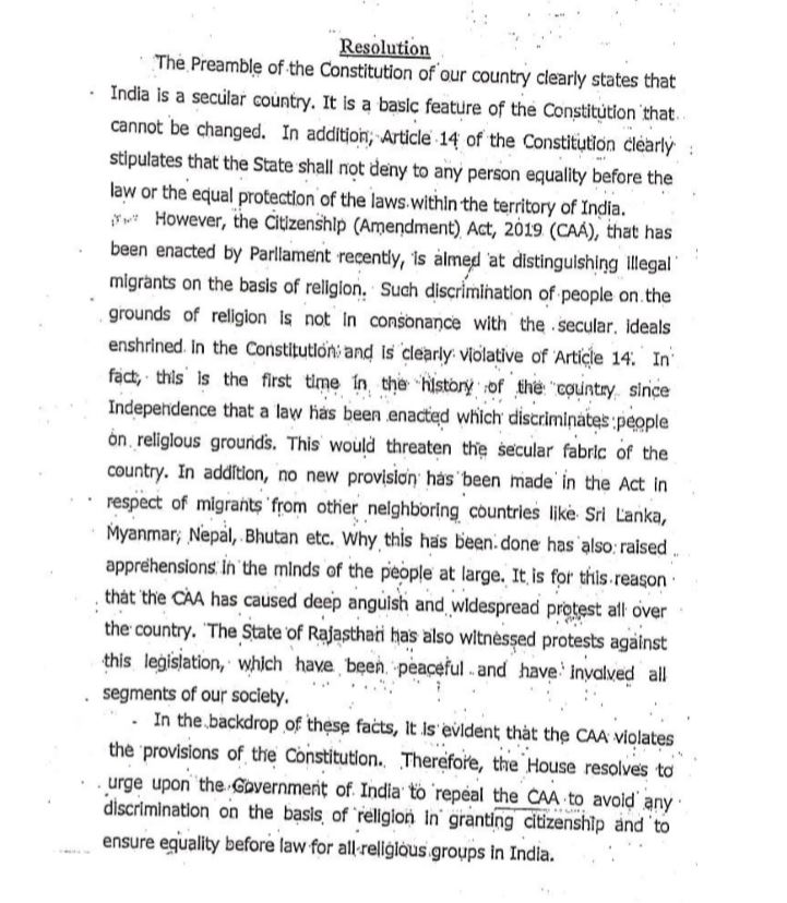 The Rajasthan assembly resolution stated that the Citizenship amendment act of 2019 discriminates people on religious grounds and that it is in violation of article 14 of the Indian Constitution.