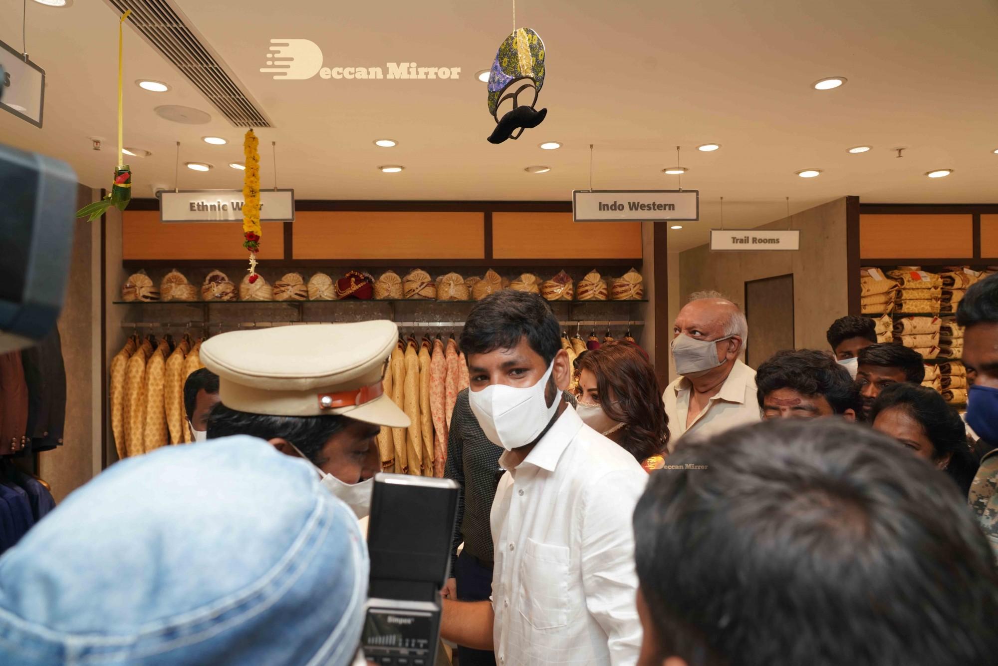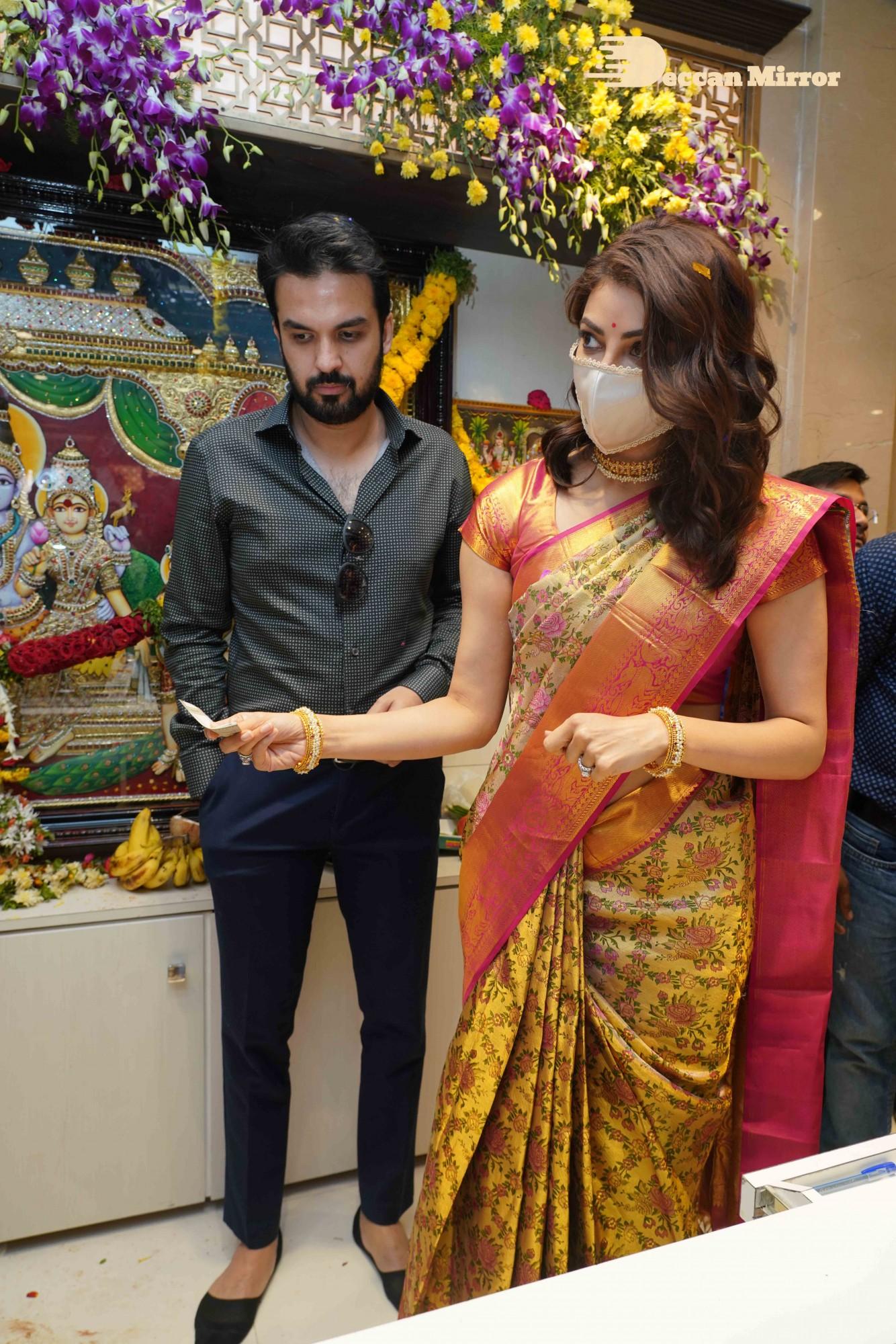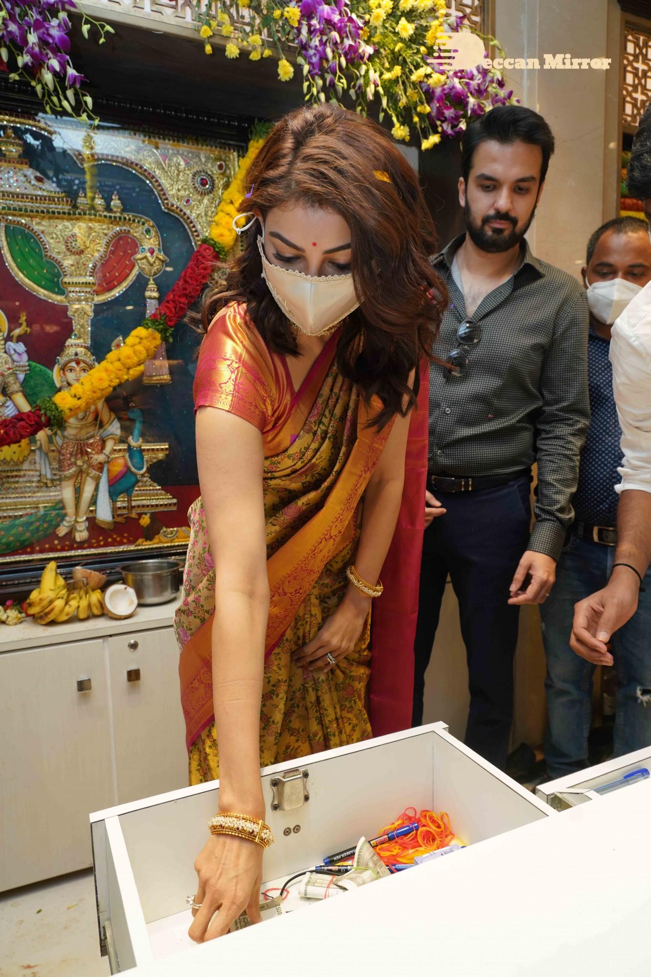 Kajal Aggarwal, joined by her husband Gautam Kitchlu, launched Kasam Pullaiah Wedding Mall in Warangal amidst fanfare.