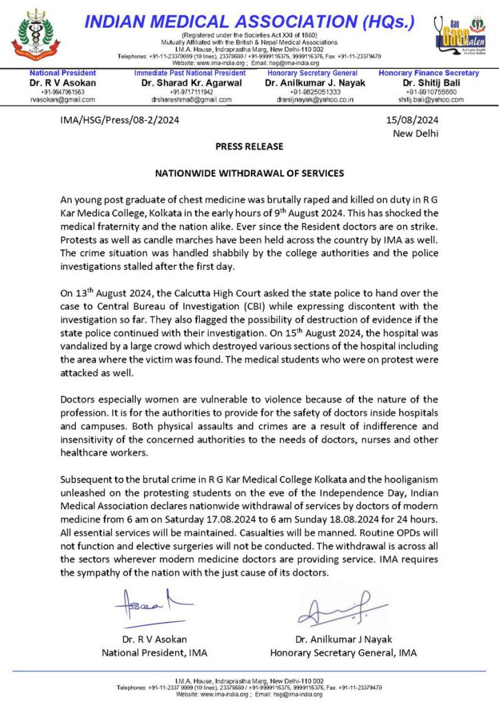 In response to the heinous rape and murder of a female doctor at RG Kar Medical College in Kolkata, the Indian Medical Association (IMA) has announced a 24-hour nationwide withdrawal of non-emergency medical services starting from 6 AM on August 17, 2024.