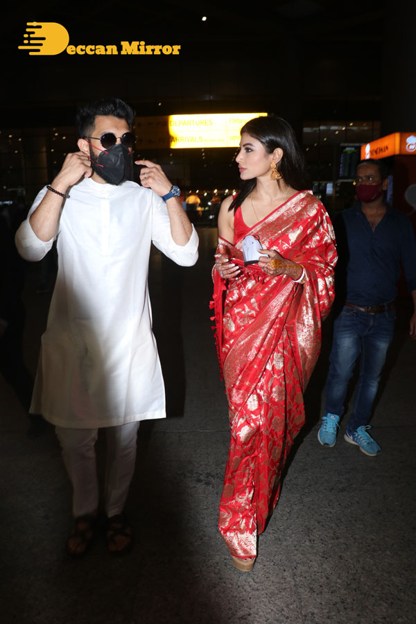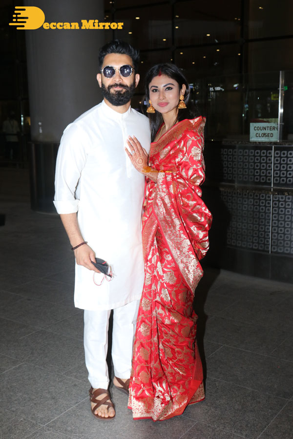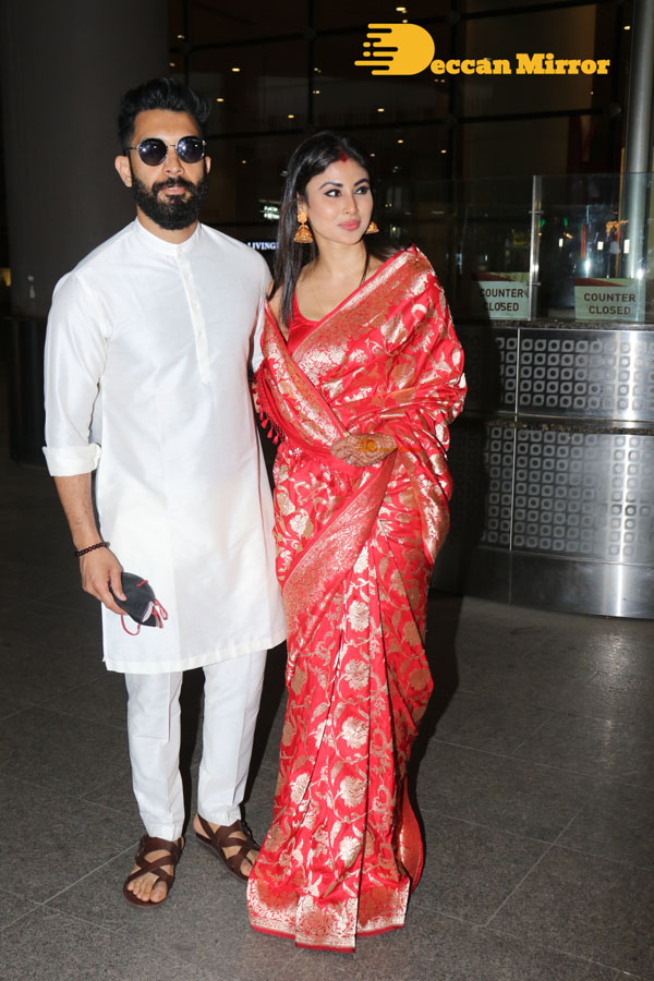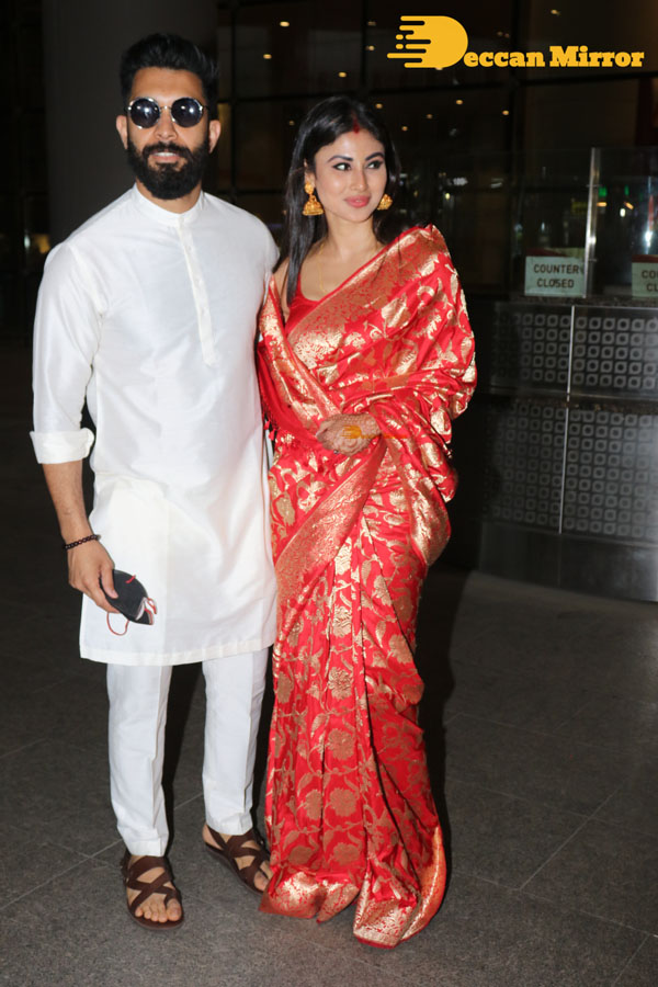 After their wedding in Goa, the newly married Mouni Roy and her Husband Suraj Nambiar are seen back in Mumbai on January 30, 2022. The actress and the Dubai-based businessman got married on January 27, 2022, according to both Bengali and Kerala traditions.
